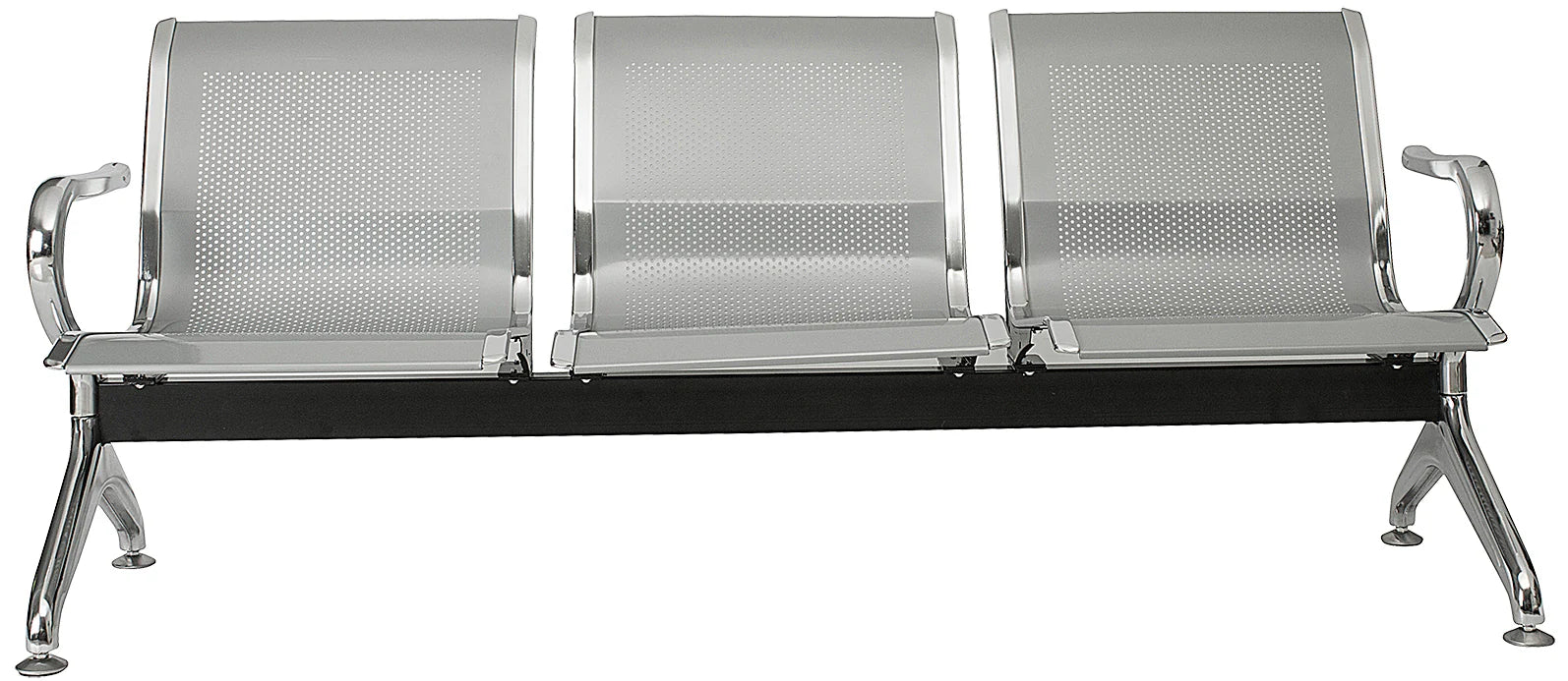 ASIENTO Y RESPALDO EN UNA SOLA PIEZA DE LAMINA DE ACERO DE DISEÑO ERGONOMICO, MULTIPERFORADO . ACABADO EN PINTURA HORNEADA GRIS. CAL. 14 PATAS Y BRAZOS EN LAMINA TROQUELADA Y SOLDADURA INVISIBLE CON ACABADO CROMADO Y CON SOPORTE PARA RECIBIR LOS EXTREMOS DE LA VIGA SIN TORNILLOS VISIBLES, ESTRUCTURA CON SOPORTES LATERALES EN CADA CONCHA FABRICADOS EN LAMINA ACABADA EN CROMO CON ALMA DE BARRA DE ACERO MACIZO. VIGA HORIZONTAL INFERIOR PARA SOPORTAR LOS ASIENTOS, TERMINADO EN PINTURA EPOXICA HORNEADADA COLOR GRIS, FABRICADA EN PERFIL DE ACERO CON PLACAS SOLDADAS PARA ATORNILLAS LOS SOPORTES DEL ASIENTO, MEDIDAS GENERALES LARGO 235 X ANCHO 60 X ALTO 78-80 CMS.